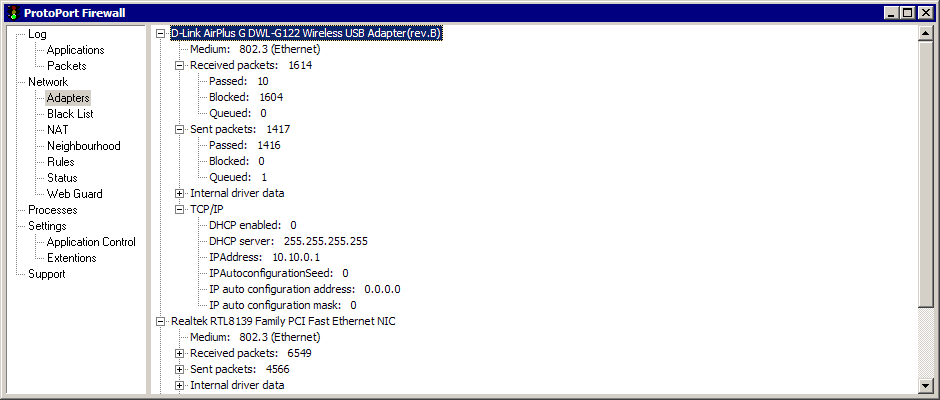 Adapter tab shows basic information about NIC (Network Interface Card) state: