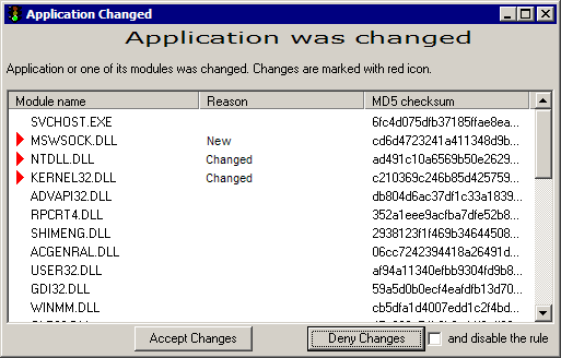 Application Control - warning windowThe window appears when application or one of its modules was replaced, or new module was loaded by application. | ||||||||||||