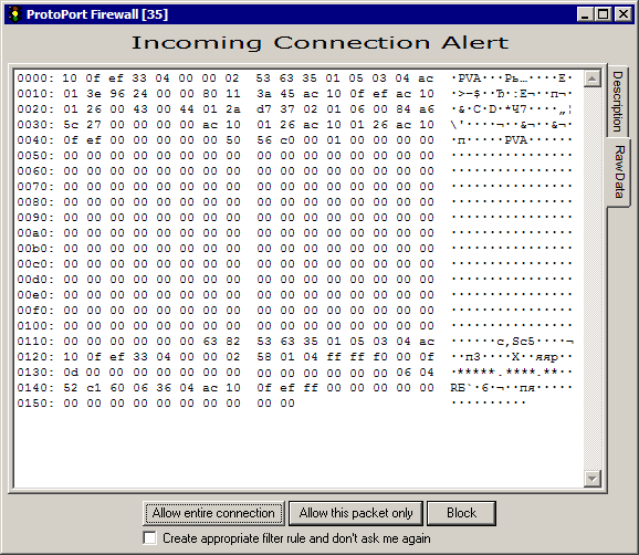 * Please note: some information on screenshot is hidden with asterisks for security means. You will see entire information even in unregistered version of Firewall. Tabs: description raw data The Raw Data tab allow to see entire packet. You may copy the packet into clibboard, if you right-click within a window, and select Copy menu item. | ||||||||||||