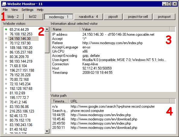4. A list of pages loaded by visitor. Search engine query is shown as well, if available. All data is shown in real time.